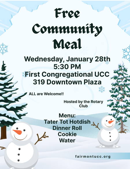 The January free community meal will be on Wednesday, January 28th, starting at 5:30 PM. The Rotary Club is serving: Tator Tot Hotdish, Dinner Rolls, Cookies, and Beverages. ALL are Welcome!