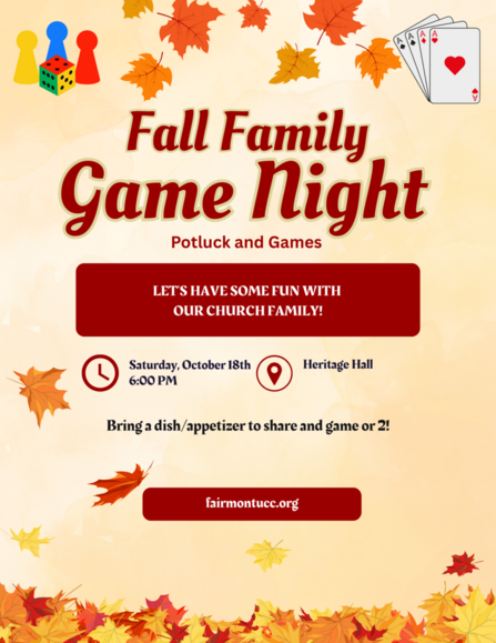 A Fall Game Night is planned for Saturday, October 18th in Heritage Hall. Starting at 6:00 PM, we’ll have a potluck and play games! Bring a dish/appetizer to share and a game, if you’d like. Let’s have some fun!