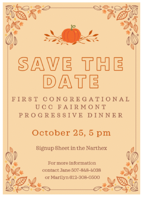 The Progressive Dinner is on Saturday, October 25th, starting at 5:00 PM. We’ll “progress” to a different location for each course! A signup sheet is in the Narthex.