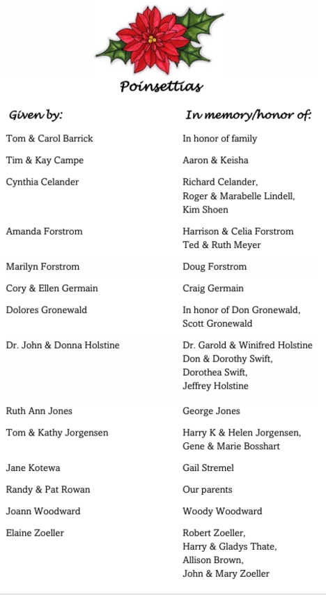 If there is a Sunday that has a special meaning to you and you would like to provide flowers, please sign up on the calendar on the bulletin board. Write your name and who the flowers are in memory/honor of. Please know that we appreciate you sharing your special memories/days with us! Contact Kay Campe with questions at (507) 236-9097 or kayanncampe@gmail.com.